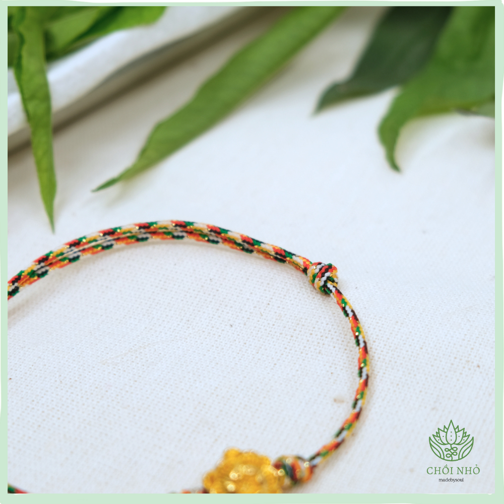 - Chất liệu: Sợi tơ tổng hợp ngũ sắc với màu vàng kim chủ đạo. Dây dày 1.5 mm. Phối charm hoa sen các màu bạc cổ / bạc sáng / vàng