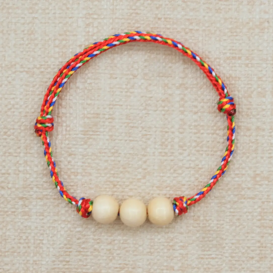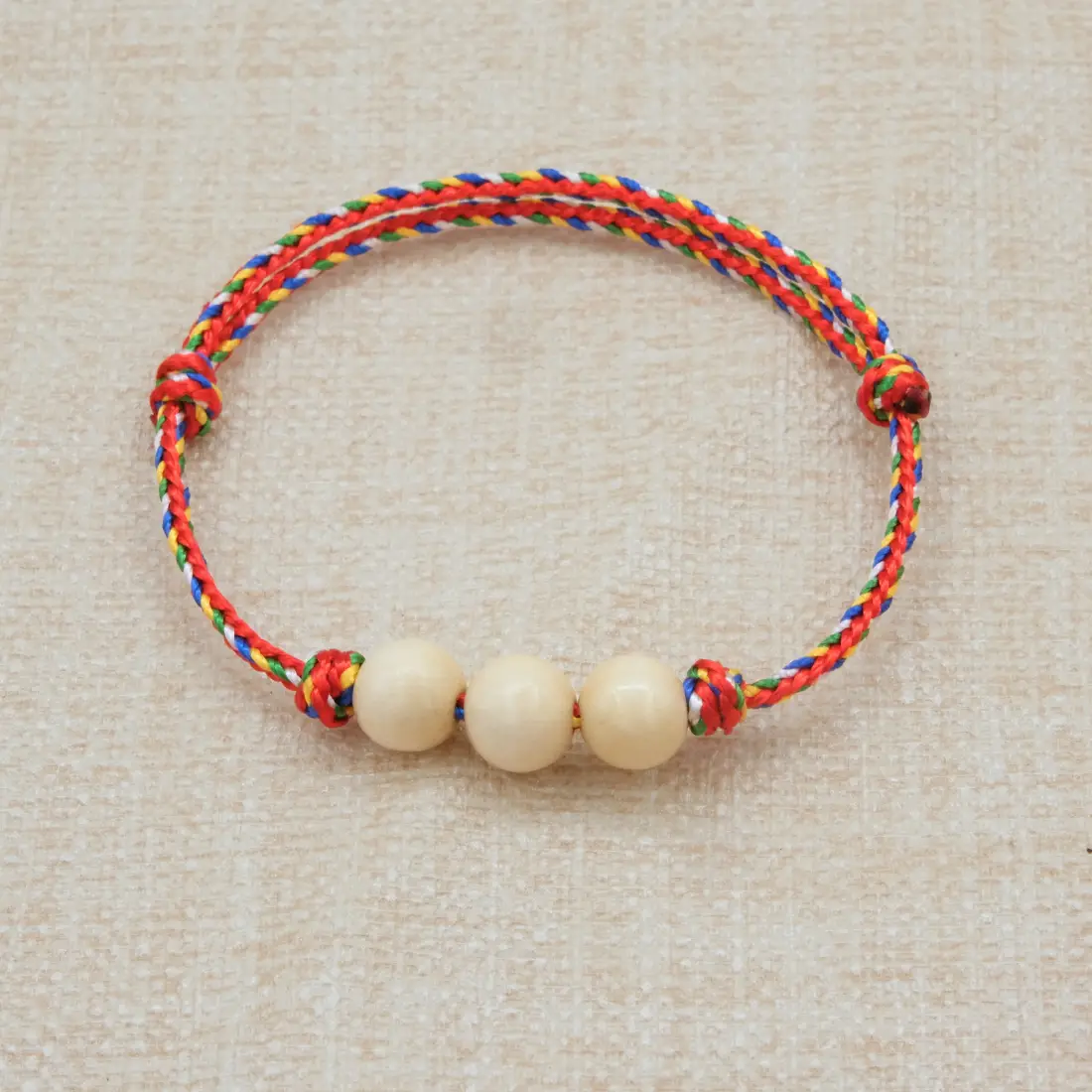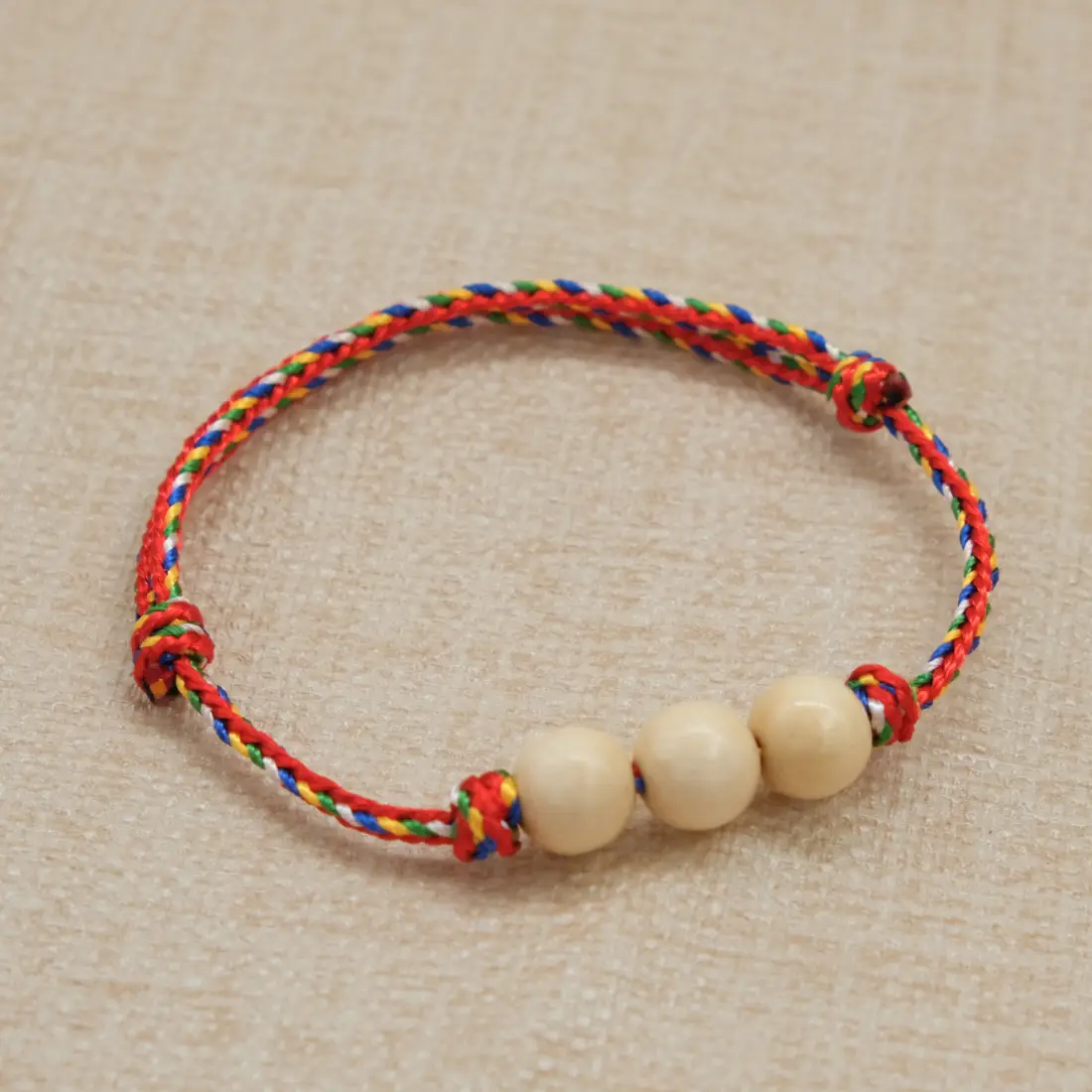 Chất liệu: dây ngũ sắc sợi tổng hợp màu đỏ đô, dày 2.0mm phối 3 hạt dâu trắng