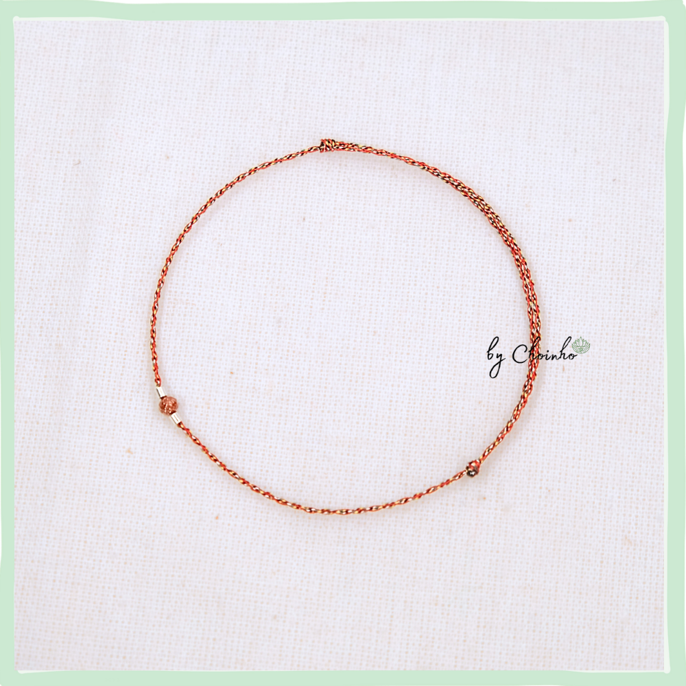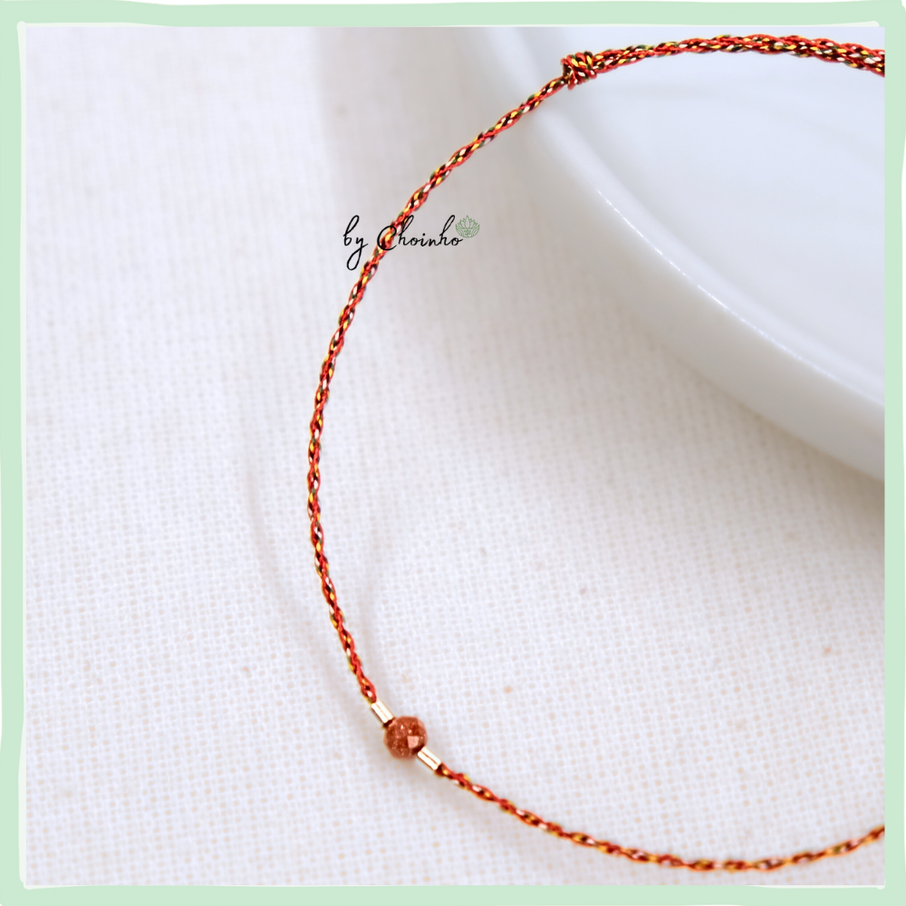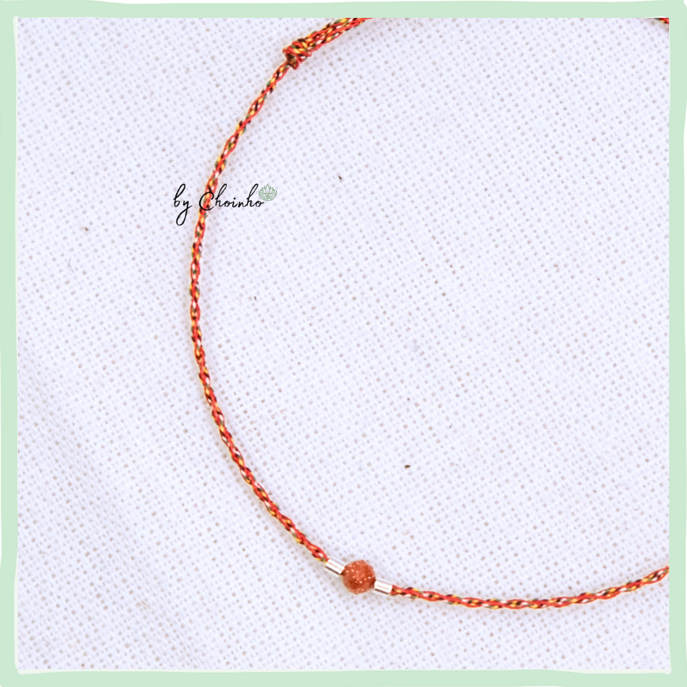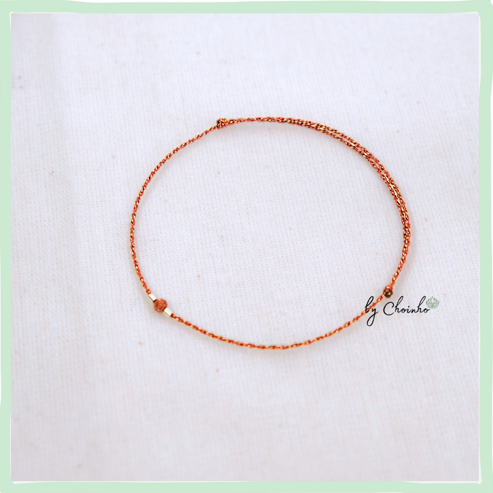 • Chất liệu:  Sợi tơ tổng hợp 5 màu với màu đỏ là chủ đạo. Dây dày 0.5mm. Phối  1 hạt kim sa nâu và ống bạc 1.5mm